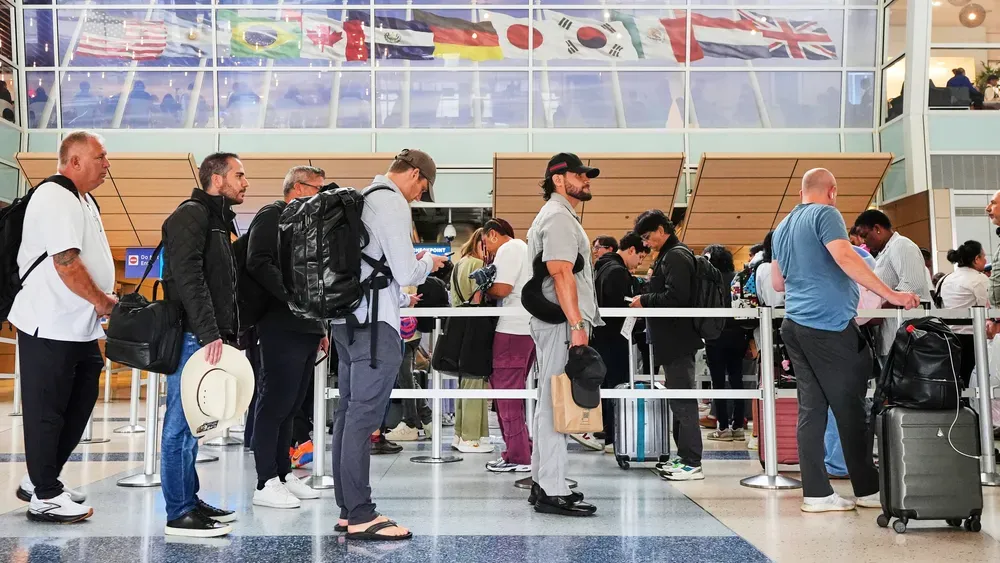 Travelers Stand in line at a security checkpoint before boarding their international flights at Dallas Fort Worth International Airport, Friday, Aug. 29, 2025, in DFW Airport, Texas. Photo Credit: (AP Photo/Tony Gutierrez)