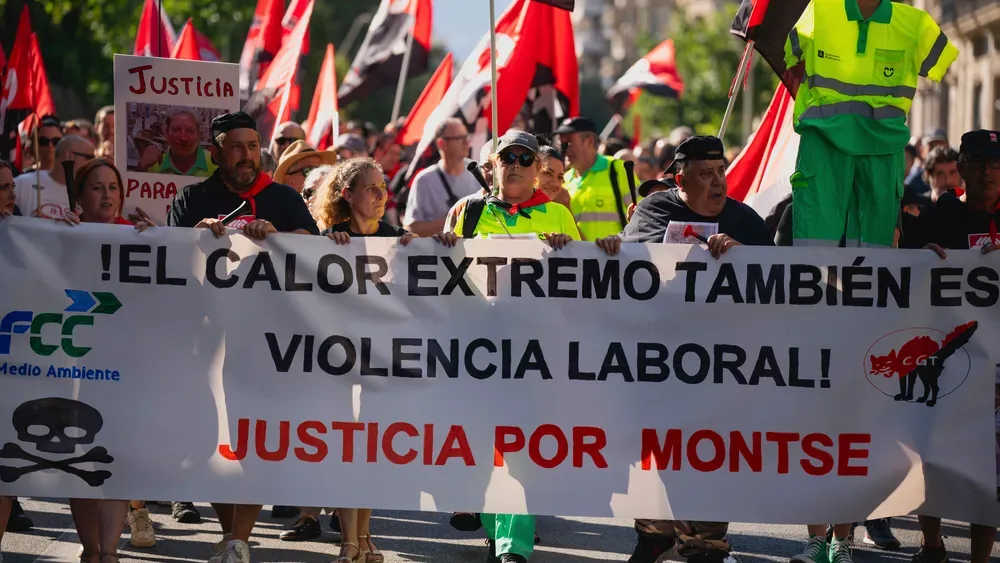 FILE - People march in Barcelona to protest the death of street cleaner Montse Aguilar during a recent heat wave in Spain, Wednesday, July 16, 2025. The banner in Spanish reads, “Extreme Heat is also Workplace Violence. Justice for Montse." Photo Credit: (AP Photo/Joan Mateu Parra, File)