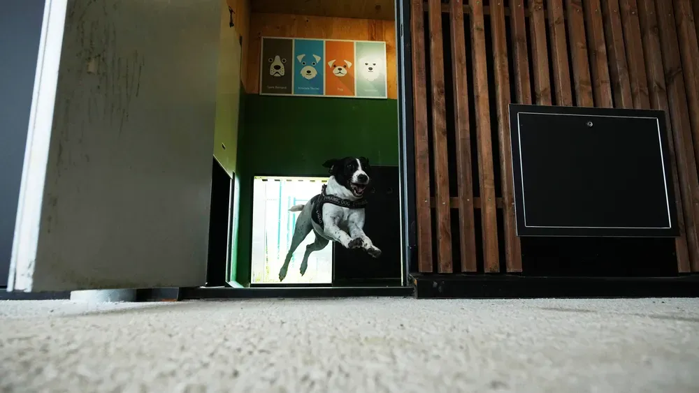 A dog named Zoe, runs out from one of the rooms of the Dog Relais, a hotel for dogs at Rome's Fiumicino International Airport, Wednesday, Sept. 17, 2025. Photo Credit: (AP Photo/Alessandra Tarantino)